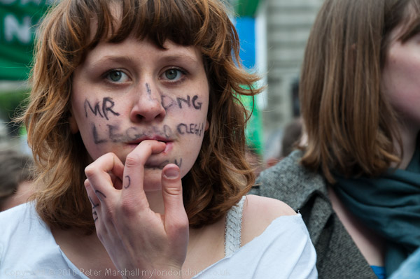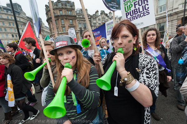 march got very noisy at timesI thought I would be in plenty of time to photograph the front of the march as it came up Whitehall when I arrived at Trafalgar Square shortly before noon, but it had obviously started earlier than I had been told, and the front was already out of sight on its way towards the rally at Hyde Park.