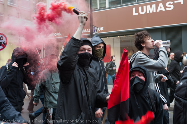 The Black Bloc, mainly anarchist protesters, walked and ran from Trafalgar Square to Bond St and Oxford St where they smashed a few windows and threw paint and flares at shops of banks and companies avoiding paying UK taxes, including the RBS and Topshop.