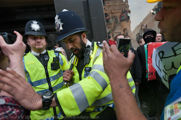 There was now there was a strong line of police protecting Top Shop, but few of the more serious anarchists remained around and many of the protesters were in fancy dress of various styles and the mood was by now largely festive. There were big cheers when it was announced that protesters had entered the Ritz.