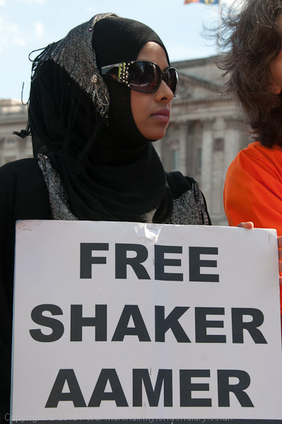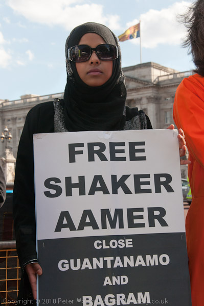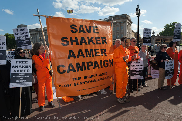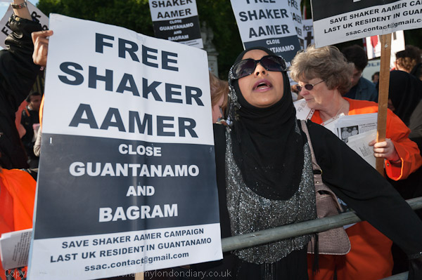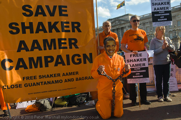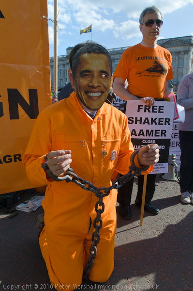 Save Shaker Aamer Campaign with orang Guantanamo jumpsuits and a man in chains with an Obama mask