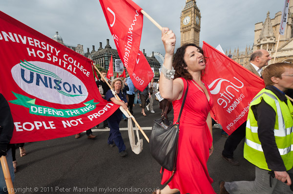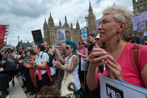 The protest was enlivened by some unofficial additions, including a young man suggesting we should take action over Palestine, and an Asian-looking woman with a silver cross who I think was suggesting we should all give up our wicked ways and turn to Jesus. Perhaps more relevant was one of the funnier posters around Westminster with a caricature of Rebekah Brooks suggesting that since she had experience with telephones and lying she might have a good career opportunity on the end of an Essex girl phone line service.