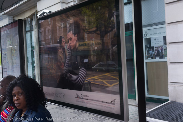 display on 8 bus shelters in CamdenOne of the more interesting shows of the London Street Photography Festival was Seen/Unseen, centred on buses, and I found George Georgiou's pictures taken from inside the bus looking out interesting on several levels. Displayed in the gallery on two rows each of three monitors, they were also on eight local bus shelters, at one of which I took the picture above on my way home from the opening.