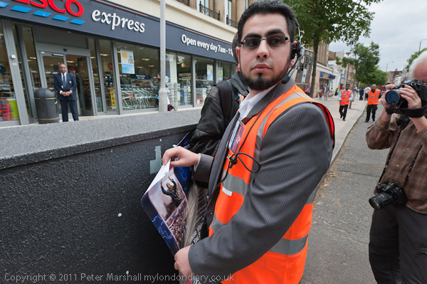 As we were photographing Peter Tatchell beside a poster advertising the event outside the hall holding a placard reading 'Hizb ut-Tahrir = clerical fascism No to Hizb / EDL /BNP' , one of the Security men came up and stood in my way before tearing the Hizb ut-Tahrir poster from the cabinet on the street and taking it away. I've reported on many Hizb ut-Tahrir events over the years - including at least one women's demonstration and this was the only one where I've encountered any negative attitudes towards the press by them.