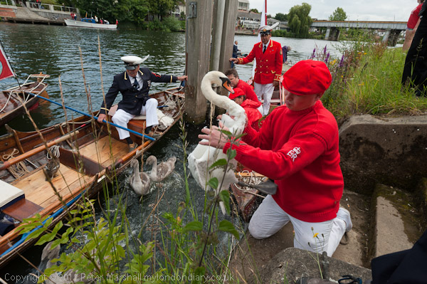 The annual swan upping, one of this country's oldest traditions, started in the 12th century makes starts at Sunbury on the third Monday in July and takes a week going up the River Thames catching and marking this year's cygnets.