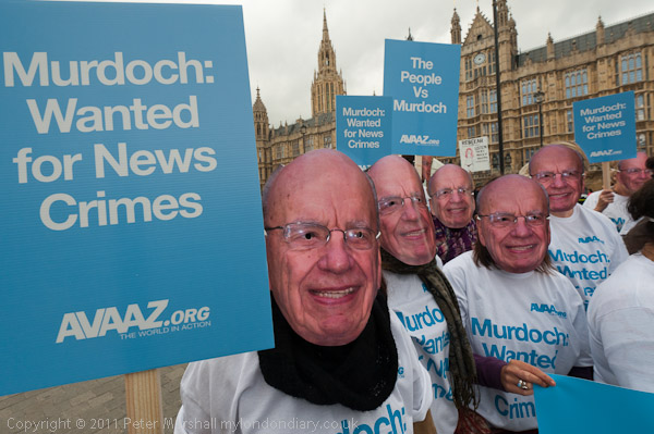 The demonstration was held as others waited nearby for Murdoch to appear for his hearing in front of a Commons Committee. Around 40 Avaaz protesters donned Murdoch masks and t-shirts with the message 'Murdoch Wanted for News Crimes' although some disappeared before the final photo call, and unfortunately it was hardly the "massive, creative action" that Avaaz had hoped for.