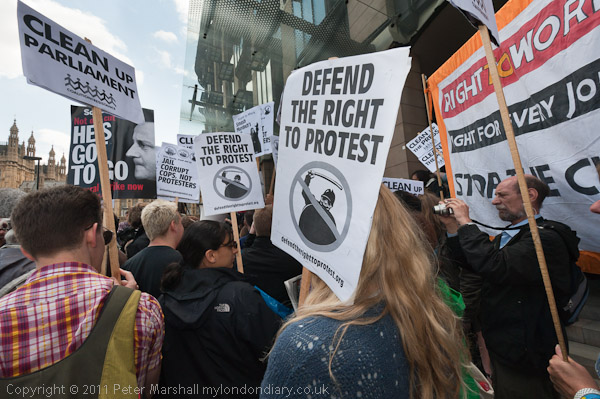 A noisy group of protesters joined the large contingent of press photographers and TV crews waiting outside the parliamentary offices of Portcullis House to get pictures and interviews with anyone involved in the scandal. While I was there most were standing around looking rather bored with only a few bothering to photograph the protest.