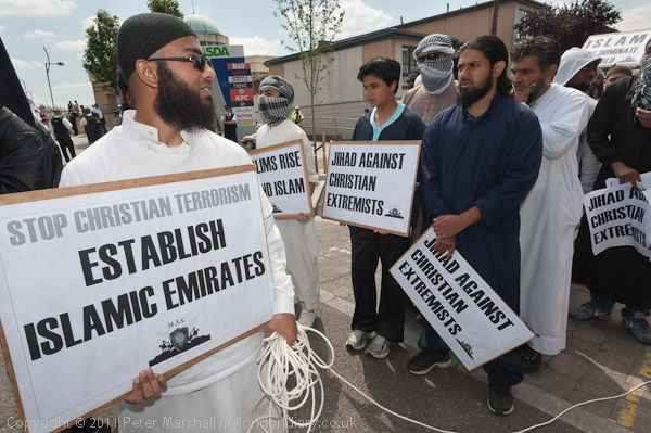 Muslims Against Crusades are a very small extremist fringe Muslim organisation led by Dr Anjem Choudary, a follower of the jailed Omar Bakri and co-founder with him of al-Muhajiroun, banned by the UK in 2005, spokesman for Al Ghurabaa, proscribed in 2006, and former leader of Islam4UK, banned in 2010. The leaflet distributed by the marchers claimed support from other groups and organisations: Waltham Forest Muslims, Convert2Islam, Salafi Media, Abu Abdullah, The Islamic Council of Britain, The International Shariah Court, The Society of Muslim Lawyers, The Muslim Entrepreneur Foundation, The Shariah Court of the UK and a spokesman for Izharudeen.com.