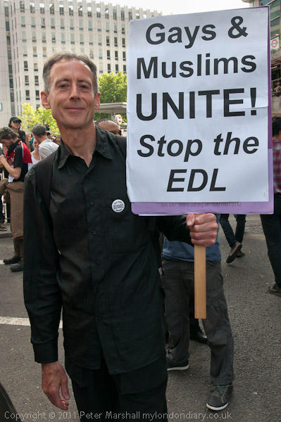 Peter Tatchell with a placard 'Gays & Muslims UNITE! Stop the EDL'