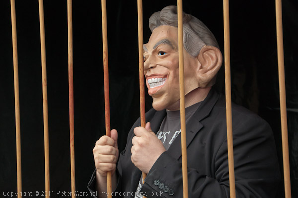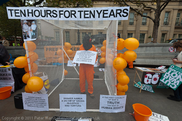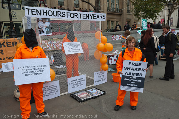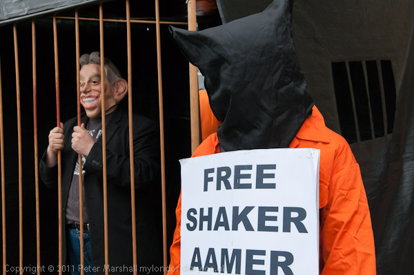 A cage held a 'Tony Blair' figure and orange clad protesters called for Shaker Aamer to be let out of Guantanamo