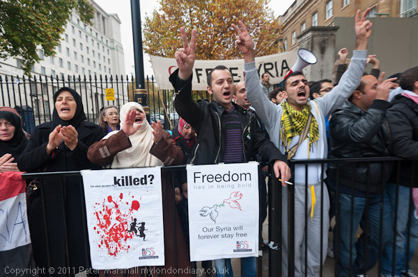 Syrians hold their flag and a 'Free Syria' banner in a protest opposite Downing St