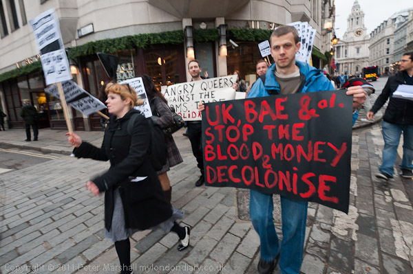 Another poster read 'UK, BAE & al. Stop the Blood Money & Decolonise'