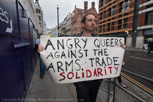 One man carried the 'Angry Queers Against the Arms Trade poster