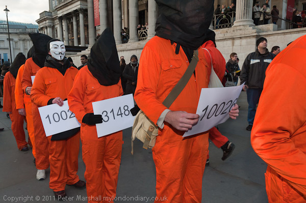 The rally came on the weekend before the 10th anniversary of the setting up of the illegal US prison camp at in the US military base at Guantánamo Bay, Cuba on 11 January 2002. Although President Obama came into office pledging to close the camp down and end the discredited military trials there, he has failed to do so, authorising the continued regime of arbitrary detention without charge or trial. 171 prisoners are still detained there.