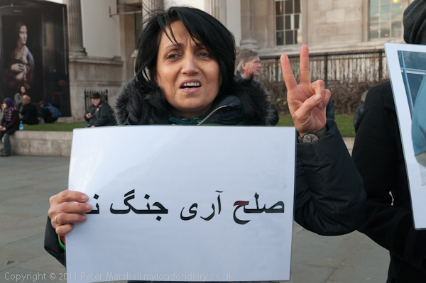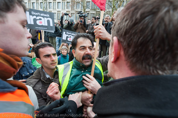 Although everyone present at the 'Hands off Iran & Syria' protest was against US or Western Intervention in Iran or Syria, there were some noisy protests which came to a head while Abbas Eddalat of the Campaign Against Sanctions and Military Intervention in Iran was speaking, from protesters representing the Free Iran 'Green Movement'.