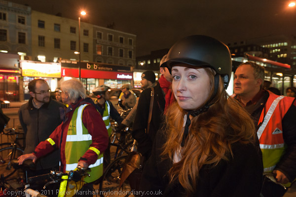 Gradually cyclists began to arrive for the protest, waiting with their bikes on the wide pavement in front of Kings Cross, along with a dozen or so police officers on bikes and a few others. Among them were Bikes Alive spokesman Albert Beale, who had said that this protest "is the first step in a campaign to stop – by whatever nonviolent means needed – the completely unnecessary level of deaths, injuries and fear inflicted by motorists on the more vulnerable" and Green Party mayoral candidate Jenny Jones who stated "London’s roads must be fixed urgently if we are to make them safe for cyclists and all other road users. This is the Mayor’s responsibility, and I hope that if we make a statement through peaceful, direct action he will start to listen." Also present was Tamsin Omond of Climate Rush, who have organised several cycle protests, including one last year against London's terrible air quality with briefly blocked a junction a little to the west of tonight's protest.