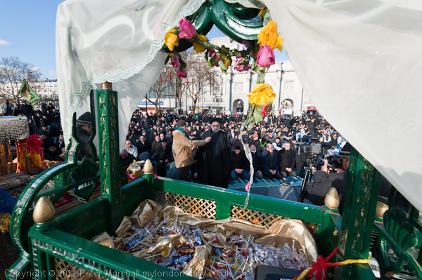 Today's procession included three large gold and silver replicas of the shrines of Karbala; known as Shabbih, they are over 10 feet high and the largest in Europe. There was also a decorated and blood-stained white horse or Zuljana representing the horse of Imam Husain, a cradle remembering his 6 month old child Hazrat Ali Asghar who was also murdered and a ceremonial coffin. Throughout the event there were people coming up to revere these, laying their hands and sometimes their faces on them