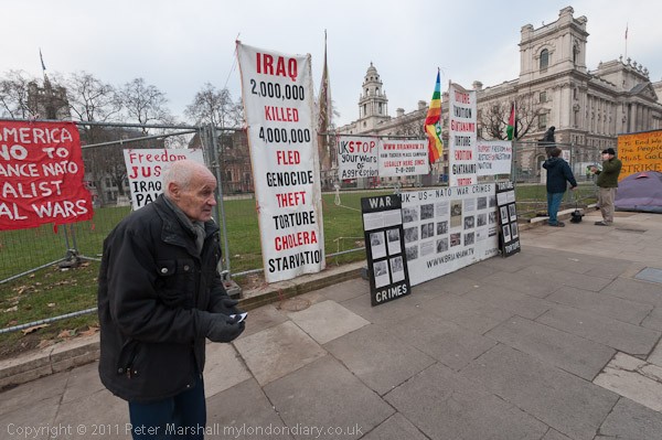 I went to Parliament Square this lunchtime and was able to talk with both Maria Gallastegui of the Peace Strike campaign and one of the regular protesters in the Parliament Square Peace Campaign, who was there in front of the display handing out strips of paper with the web address of the campaign, now at the BrianHaw.tv blog. The pavement looked very empty without the tents, except for a couple for the Peace Strike, along with their two large boxes, but the Peace Campaign poster display was still intact. It has been removed, almost certainly illegally, by police on two occasions during the 3881 days of the protest so far, most recently on 31st August 2011. There were a couple of police at each end of the pavement, with more walking around the area, and at least one police van with officers inside just around the corner.