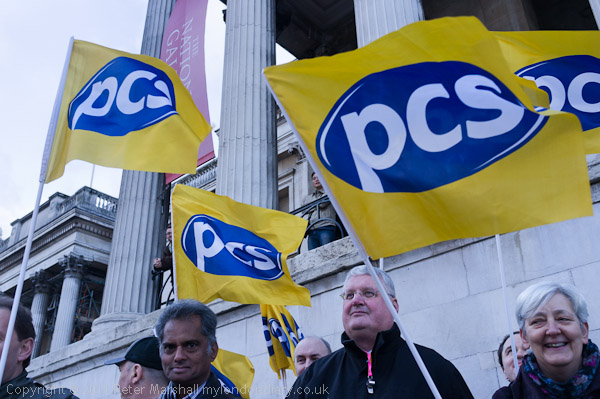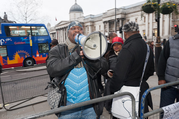Several hundred people came to the rally at Trafalgar Square where there were speeches by Lib Dem Baroness Sarah Ludford MEP, solicitor Louise Christian, Lindsey German of Stop the War, Kate Hudson of CND, journalist Victoria Brittain and others, including student representatives, trade unionists and other activists. Among those taking part were a number of 'Anonymous' protesters in 'V' for Vendetta Guy Fawkes masks who had come from the Occupy London protest camp at St Paul's Cathedral.