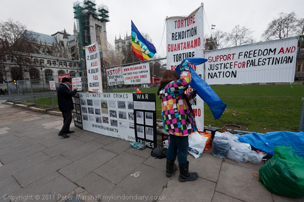 The late Brian Haw's Parliament Square Peace Campaign was continuing today, Day 3881, despite the police seizure of tents from the square and the arrest of leading campaigner Barbara Tucker last night. The Peace Strike campaign in the square had earlier in the day had an injunction preventing their eviction extended until a hearing in March.