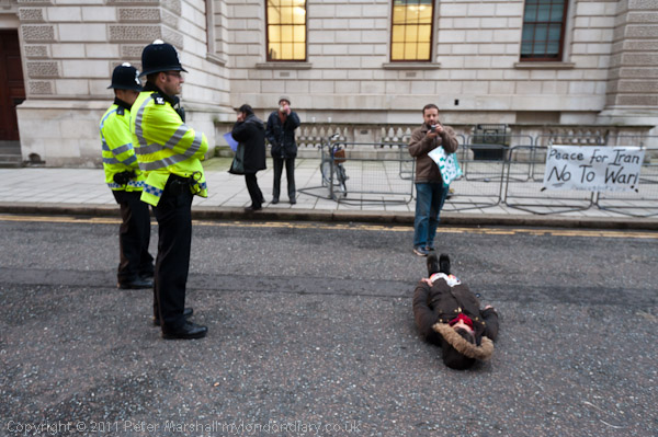 One of those present lay briefly on the roadway in King Charles St and was threatened with arrest. The protesters shouted noisily at a large group of Norwegian visitors and handed out leaflets to tourists going down the road