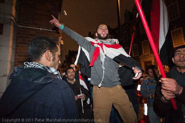 Around a hundred people, mainly Egyptians, came to the embassy in London in solidarity with the estimated 300,000 who marched today to Tahrir Square to mark the first anniversary of the Egyptian revolution on 25 Jan 2011. There was some noisy chanting and several speeches, including one from Chris Nuneham of Stop the War.