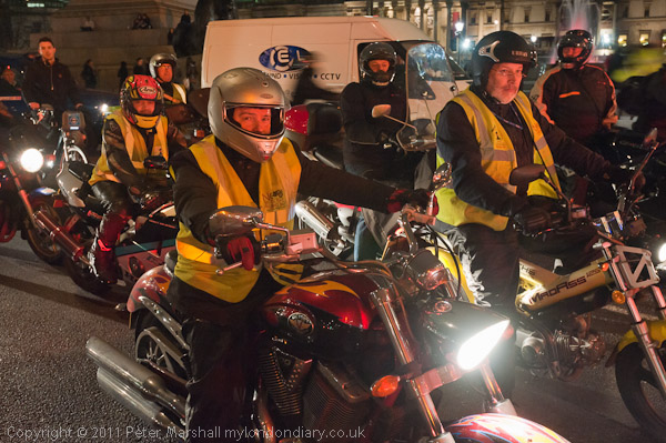 Their protest rides are held regularly on Wednesday evenings, with large groups of motorcyclists riding slowly in a pack around Central London, causing some build up of traffic. I watched them riding several times around the gyratory system at the south end of Trafalgar Square before heading off under Admiralty Arch. Protests at the time of the Queen's jubilee and during the Olympics could add to the traffic chaose and gridlock already expected.