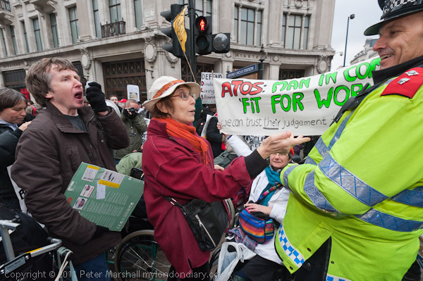 Despite the obvious anger of the disabled at the cuts which will severely affect their lives, the protest remained well ordered. The police officer in charge walked through the protesters, at first trying to find someone in charge (and of course nobody was) and then talking and joking with the protesters. Later, at 13.23, he read out a statment informing the protesters that they were committing an offence by blocking the road, but most of the protesters made clear that they intended to ignore this. He then came and talked with some of the protesters, and when some told him they would like to continue their protest on the pavement, he brought some constables across to help clear a route through the crowd for them to do so. For a moment it seemed as if police were considering clearing the road by force - a FIT team had arrived and was filming protesters and there were members of the Territorial Support Group with bolt-cutters seen around the corner, and 'bust cards' were handed out the the protesters, but then the mood lightened and the officer in charge seemed more relaxed and I heard him say that he hoped they would leave soon.