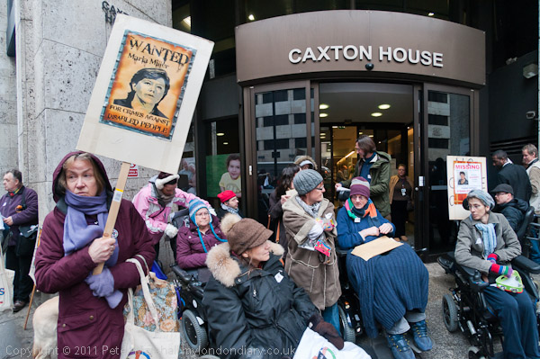 Protesters outside Caxton House with placards of Maria Miller 'Wanted For Crimes Against Disabled People'