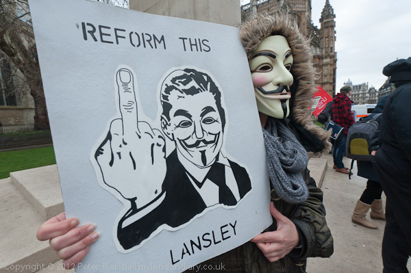 A woman wears an 'Anonymous' mask and holds up a poster 'Refore This Lansley'