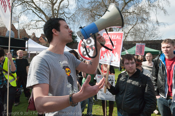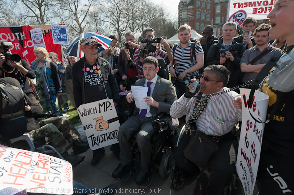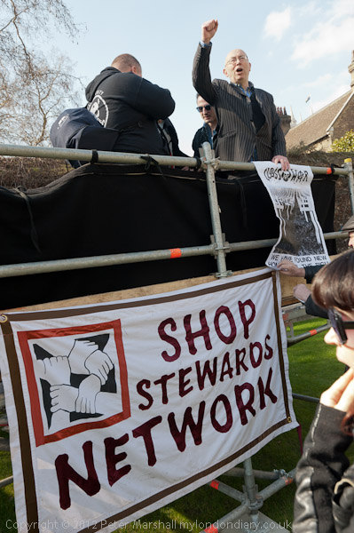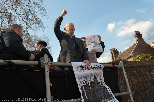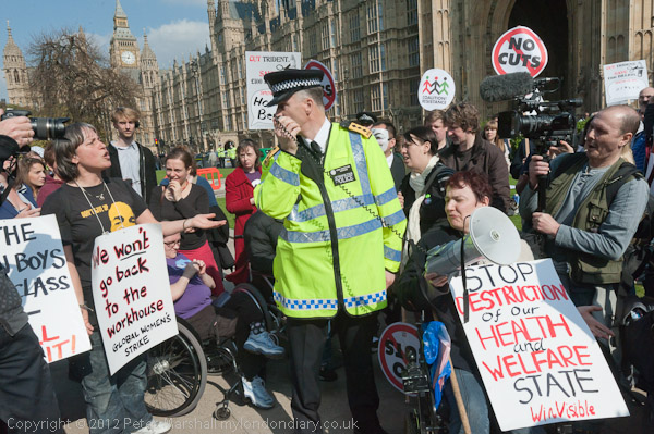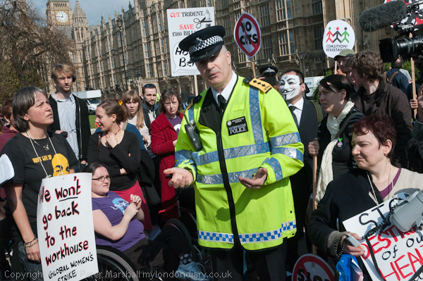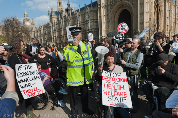 A police officer takes the microphone to ask the protesters to move to Old Palace Yard, as they are on private