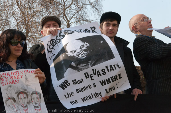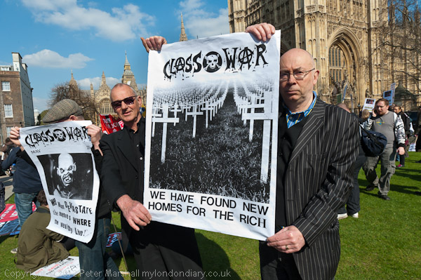 Ian Bone (right) holds up a Class War poster 'We have found New Homes For The Rich!' of a military cemetery