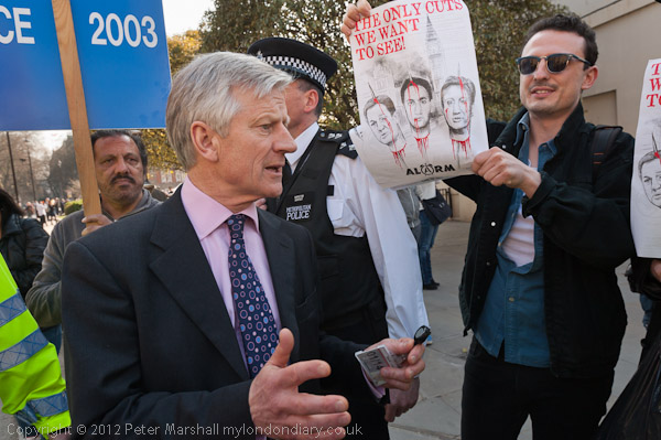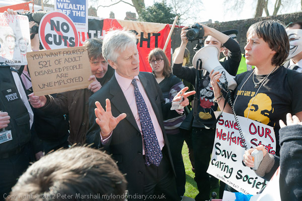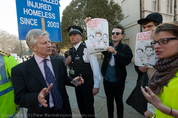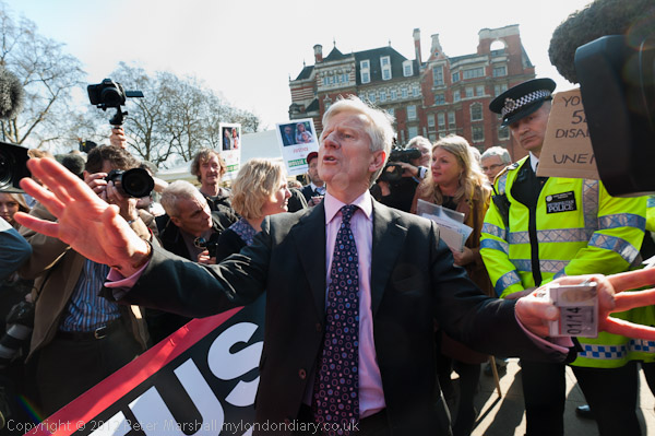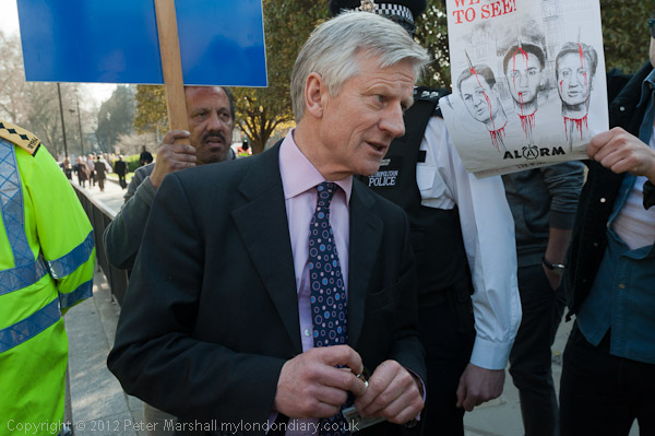 He was escorted back to the House of Lords by police officers and Alarm protesters with posters
