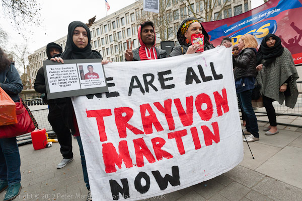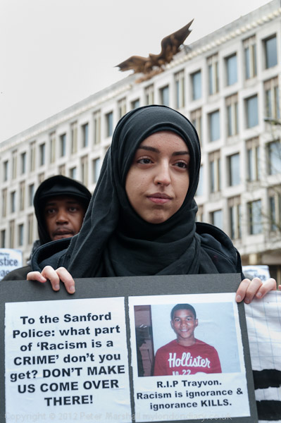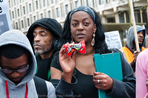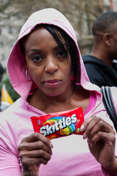 Posing with banners, placards, Skittles and hoodies in front of the US Embassy