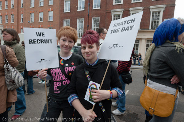 The Dyke March placards with the battleaxe logo, 'We Recruit' and 'Snatch The Day'