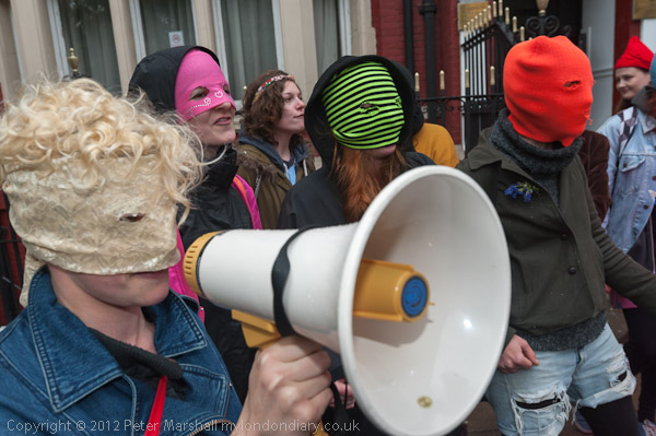 People gathered outside the Russian embassy and put on hoods like those worn by Pussy Riot