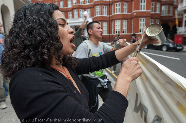 The London protest opposite the Colombian embassy in Knightsbridge to show solidarity with them was organised by Movimiento 22 with the Colombia Solidarity Campaign, and by the time I left halfway through the three hours was still growing with just over 30 people present. They leafletted passers by, chanted slogans, displayed banners and placards and made a great deal of noise by banging small sticks on empty tin cans. A couple of