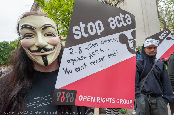 The London protest was one of well over a hundred across Europe from Ireland to Turkey and Georgia as well as in Canada today, with massive protests expected in Eastern Europe following those earlier in the year, although the London one was only attended by a little under a hundred people. Protests in the UK are also against the Digital Economy Act passed with virtually no parliamentary debate in the tidying up process during the final days of the Labour government and which is already being used to force ISPs to block access to some web sites.