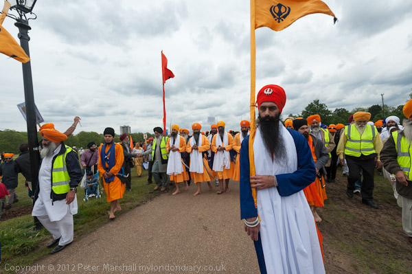Eventually the march began to form up, led by a group of Khalsa marching barefoot; two men in blue robes and red turbans carrying the Sikh standard and a few yards behind five in orange with their swords held upright - the five 'Blessed Ones' (Panj Pyare.) Behind them were a group of mainly young men carrying black coffins, followed by young men and women carrying long poles with black flags, both symbolising the thousands of Sikhs killed in the 1984 genocide and since then.