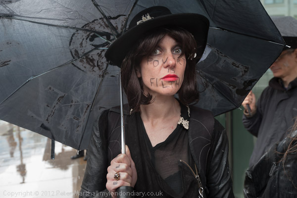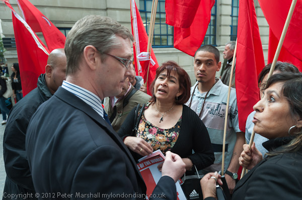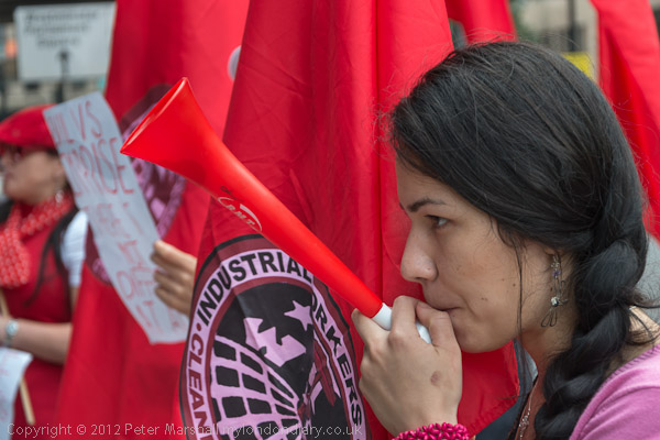 Police came briefly and asked the protesters to ensure that there was a passage kept clear along the pavement, and after talking with the protesters and the building security soon left. Like all the IWW protests this was a lawful if very noisy event.