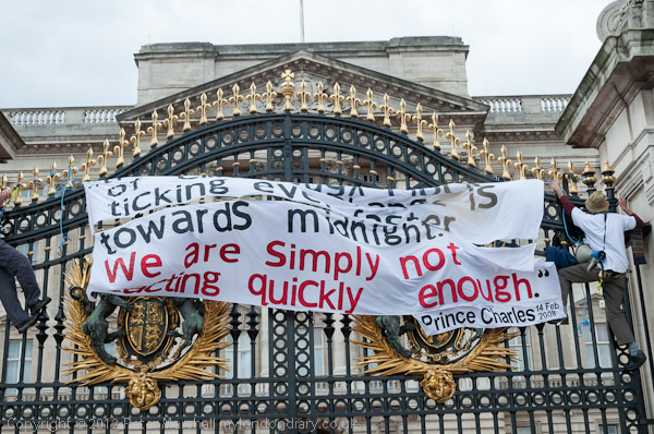 'Climate Siren' protesters scaled the gates of Buckingham Palace this afternoon with banners in protest at the failure of the Rio+20 Earth Summit. When I arrived, there were a pair of protesters locked to the top of each of the two tall ornate gates in front of the palace, holding banners across each of them. On the bottom of the largest banner was a quote from Prince Charles, who talking about climate change on 14 Feb 2008 said "We are simply not reacting quickly enough."