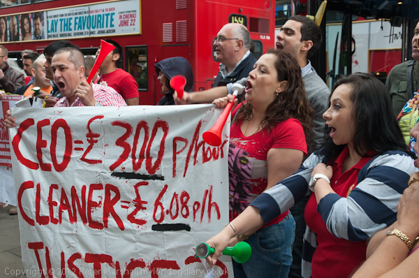 Cleaners held a noisy protest outside John Lewis in Oxford St, demanding to the paid a living wage and to be treated on the same terms as the other workers there who are 'partners' rather than being outsourced second-class workers.