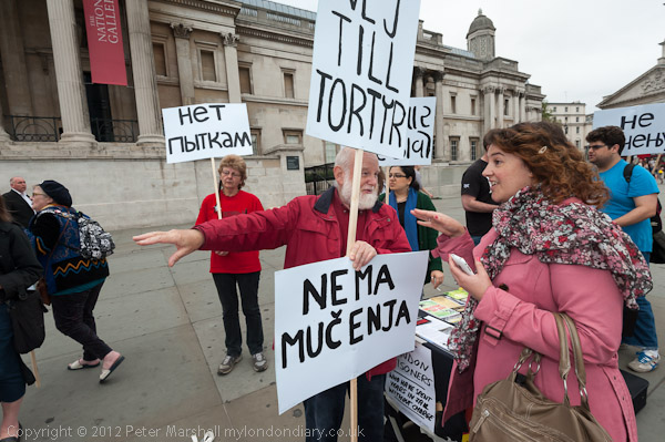 Spanish woman talks to the protesters in Trafalgar SquareOn the International Day in Support of Victims of Torture marking the 25th anniversary of the UN Convention against Torture the London Guantánamo Campaign held a vigil in solidarity with victims of torture all over the world in Trafalgar Square. The United Nations Convention against Torture and Other Cruel, Inhuman or Degrading Treatment or Punishment came into force internationally on 26 June 1987, and in 1998 the UN declared the 26 June of every year to be the International Day in Support of Victims of Torture.