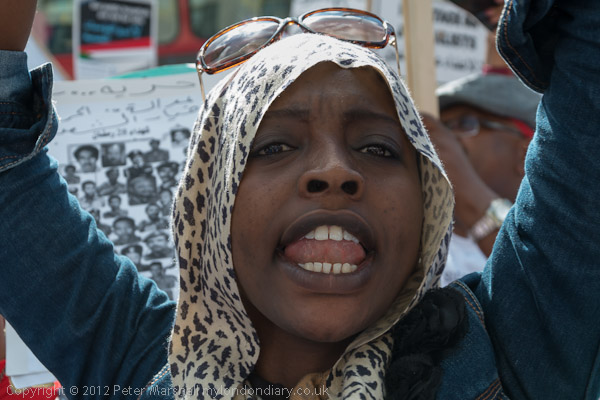 At around 4.15pm they left to march to the Sudanese embassy opposite St James's Palace where they continued a noisy protest, and after a few minutes I left them. more pictures