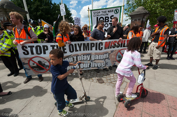 march started with a short rally on Wennington GreenProtesters marched from a rally in Bethnal Green to the Bow flats where the Ministry of Defence is planning to place surface-to-air missiles on a tower overlooking the the Olympic site, demanding that the plans be scrapped.