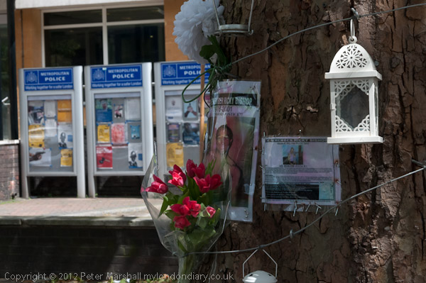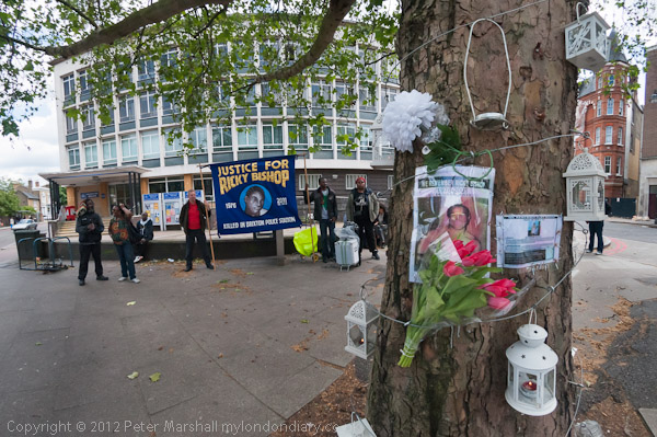 Banner, flowers, posters and candles for Ricky Bishop, killed in Brixton Police Station