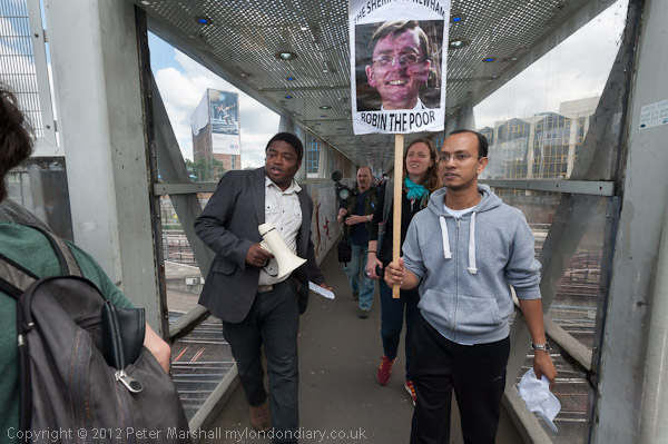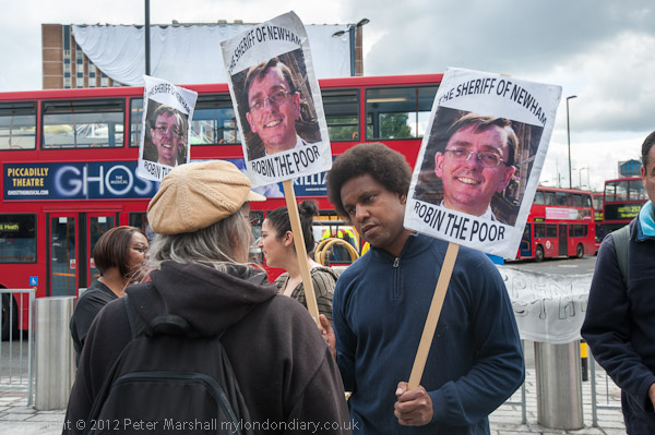 Placards showing Newham Mayor Sir Robind Wales as 'The Sheriff of Newham Robin the Poor'