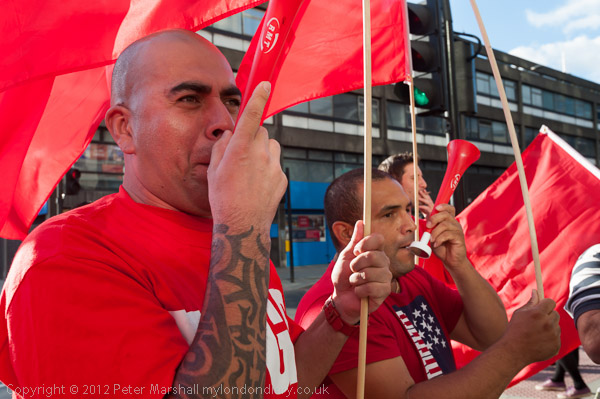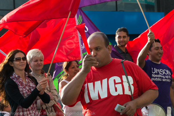The protest was called by the IWGB, the Industrial Workers of Great Britain, recently constituted when the IWW London Regional Committee decided to re-launch as the Industrial Workers of the Great Britain, reviving the name of am industrial union originally formed in 1909 and disbanded around 1924. The cleaners were the largest and most active group of the IWW in London, and their vigorous campaigning has had considerable success in getting the London Living wage and better conditions for cleaners, most recently at John Lewis.