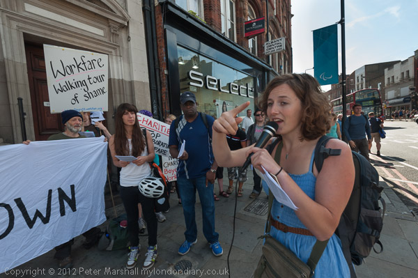 In Camden Town, a group of around 25 people held a running series of protests against various shops and charities making use of unpaid labour, including Boots, Argos, Scope, Cancer Research UK and British Heart Foundation. Outside one of the charities, speakers made it clear that it wasn't those working in the stores as volunteers or paid staff that the protest was aimed at.