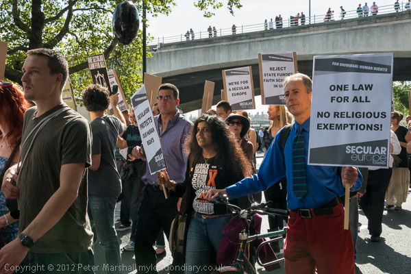 The marchers gathered at Storey's Gate, next to Methodist Central Hall and across the road from Westminster Abbey, both in their different ways reminders of the links between the state and states and religion. They had come to protest against the privileged status of religious organisations in countries around the world, but particularly in Europe, and to call for a secular Europe with complete separation between church and state and with no special status on grounds of religion, one law for all without exemptions.