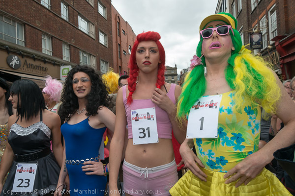 The Albert Kennedy Trust works with 16-25 year old lesbian, gay, bisexual and trans young people who are homeless or live in a hostile environment. The Soho race is sponsored and hosted by the well-known Admiral Duncan pub in Old Compton St and a temporary stage was erected outside it for the event, which was hosted by entertainer Candy Slag In Drag and Coronation Street star Charlie Condou. As well as the race, there were a number of cabaret acts performing on the stage, including Baga Chipz, Vicki Vivacious, Mrs Moore, Bette Rinse, Rose Garden, Mandy Gap and Tanya Hyde, though I left before most of them had appeared. Among those expected to take part in the race were well-known Drag Queens including Stephanie Von Clitz and Frankie Fantastique.